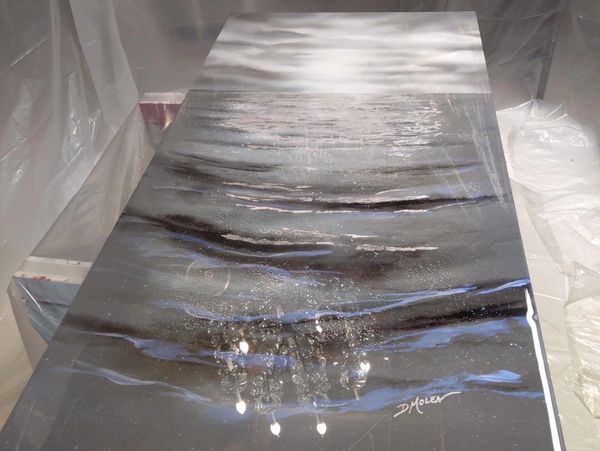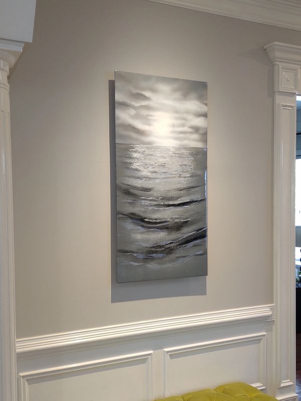 Finished. 2'X4' Mixed media on panel with silver leaf, topped with clear resin to produce the glass-like finish