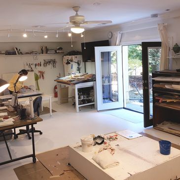 Located in Berkeley Lake, GA, my 2,800 square foot Atelier includes my painting studio, a resin booth, and my ceramics studio with two electric kilns and a gas fired raku kiln.
